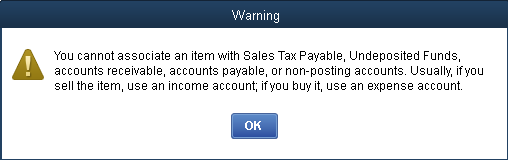 You cannot associate an Item with Sales Tax Payable, Undeposited Funds...