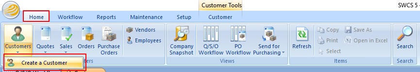 - From Home tab, click drop-down arrow under Customers icon, select Create a Customer.