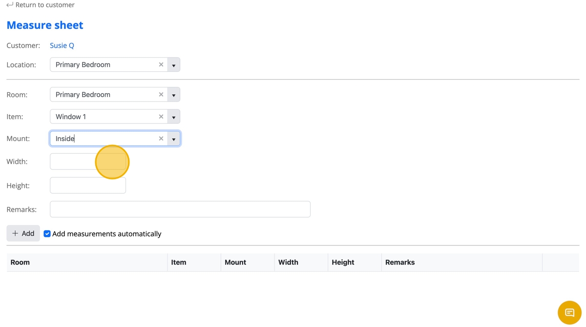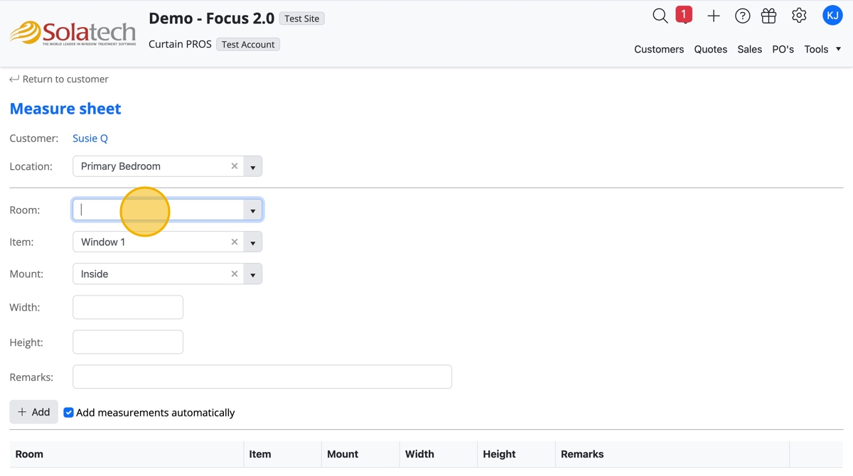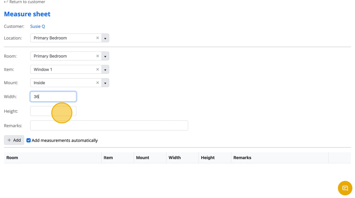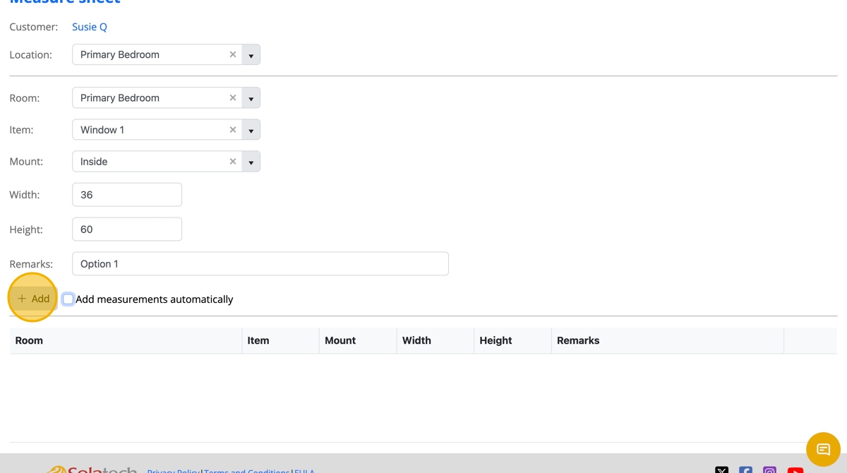 - If using a Solatech Leice laser measure, click the checkbox "Add measurements automatically" field - when clicking "add" the measurements will automatically populate in the "width" and "height" field