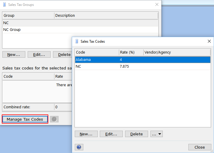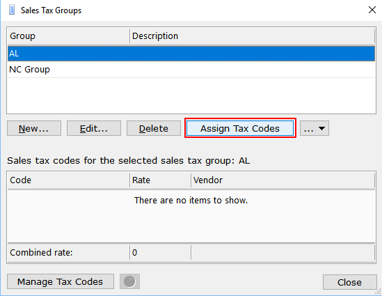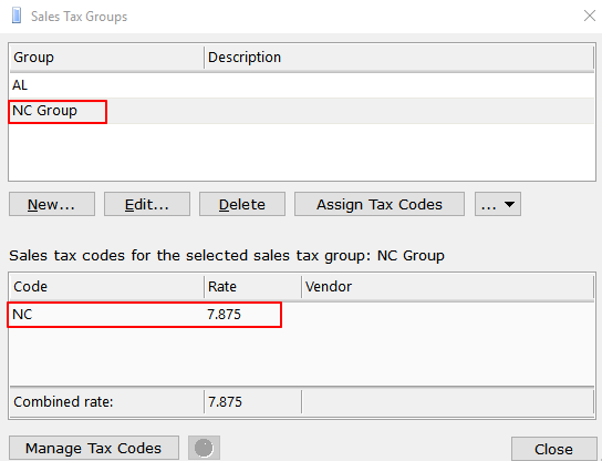 - The window for Sales Tax Groups will open. Click on the button Manage Tax Codes.