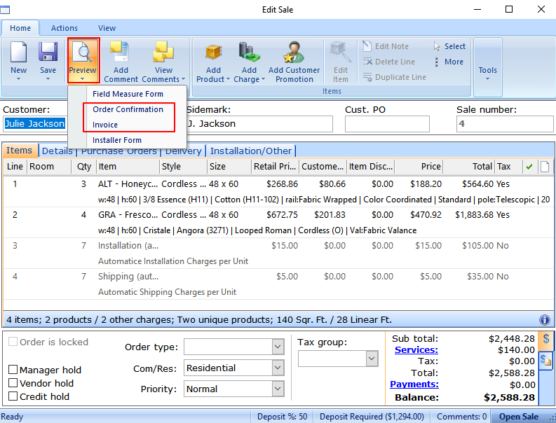 - From within Order Entry, select Preview. Using the drop down menu, select the document to have the customer sign (Quote, Order Confirmation or Invoice).