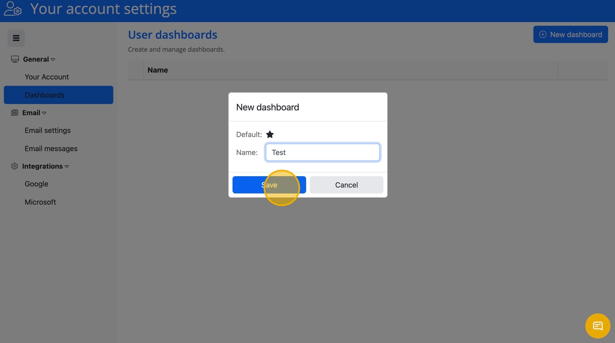 - Click "New dashboard" button or any current Dashboards will be listed under the "Name" column.