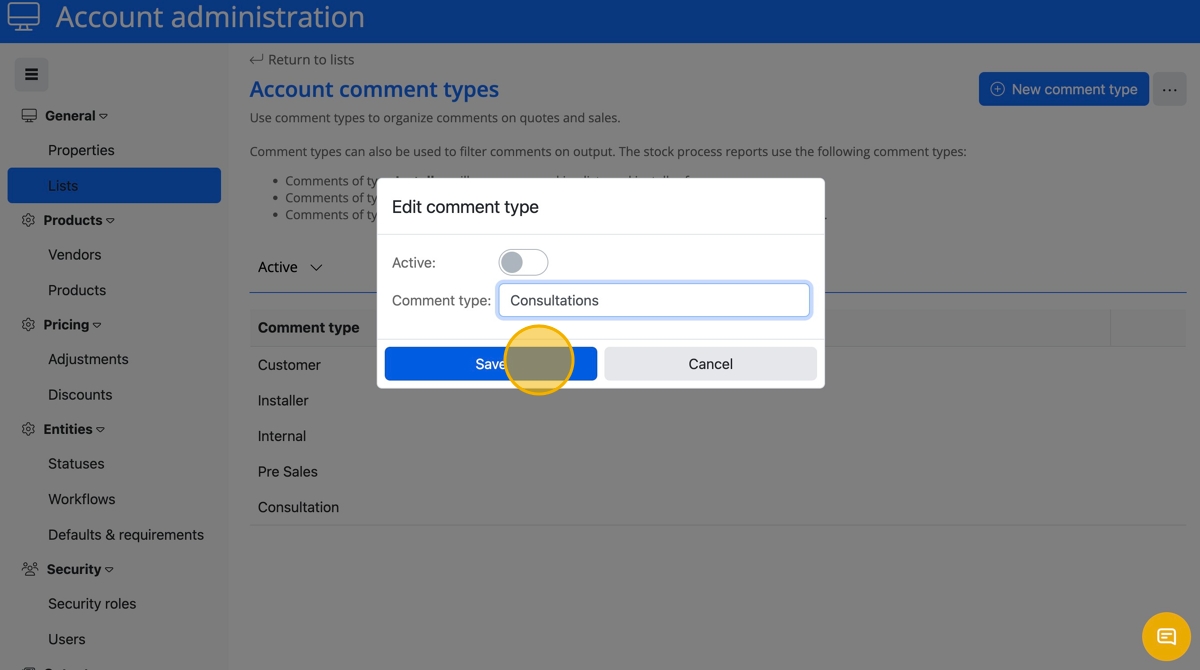- Click the "Comment type" field and add a name