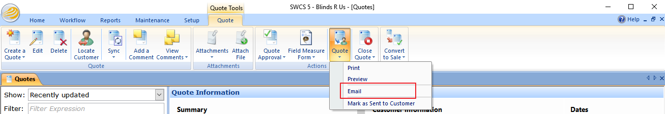 - From the Quotes Toolbar, click on 'Quote', then select 'Email' from the drop down menu.
