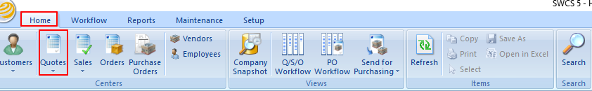 - Click on Quotes icon on the Home tab. This will open the Quotes window with the Quotes Toolbar at the top.