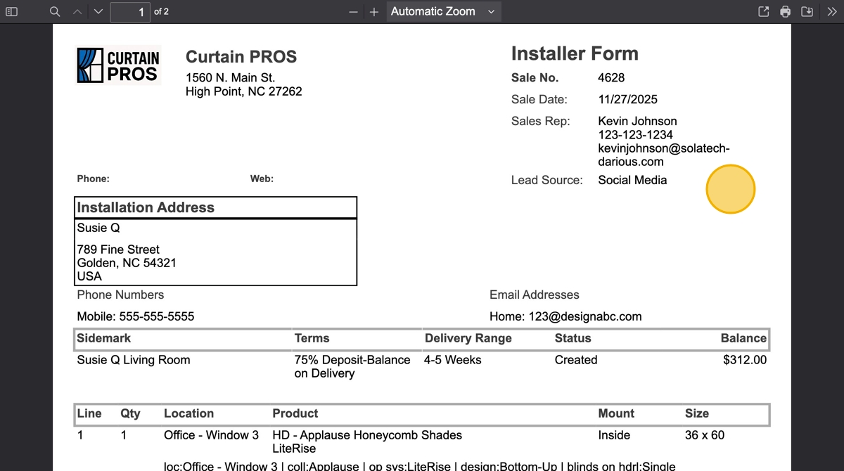 The Preview button found on the Sale page is where you can find and generate the Progress reports that are setup in the Admin Account Properties. These Progress reports are used for installer paperwork, packing list to check in products, order confirmations, etc.