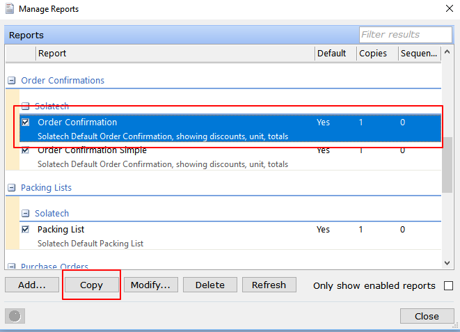 - The Manage Reports window will open. Highlight the report you plan to change, then click on Copy. This will create a report with the same name, followed by "(1)".