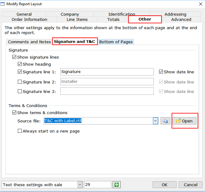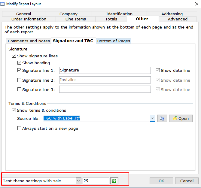 - On the Manage Report Layout window, click the “Other” tab, then the Signature and T&C tab.