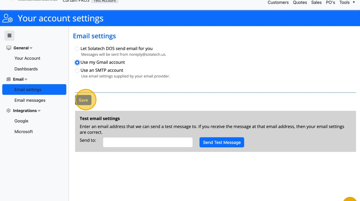 - To test the email sync, type in your email to the "Send to" field and click "Send Test Message" button