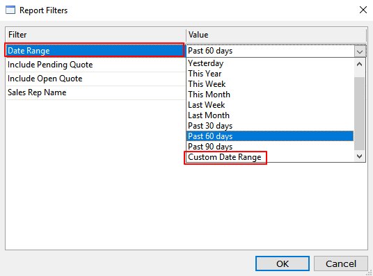 - If you choose Custom Date Range you will get a small window with a Start date and an End date. Fill those in and click OK.
