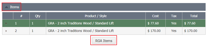 RGA stands for Return Goods Authorization. The RGA button is used when an item(s) on a specific PO is received from the fabricator that has been made incorrectly or needs to be replaced, for example. This feature is used to create a new Sale that can be resent to the fabricator.