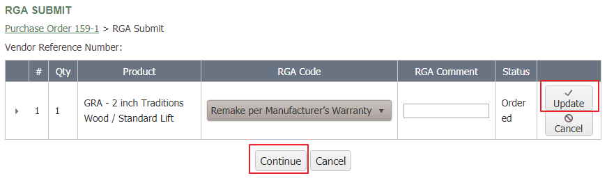 This will take you to the RGA Submit page. The product(s) will be listed along with an RGA Code, RGA Comment, and Status.