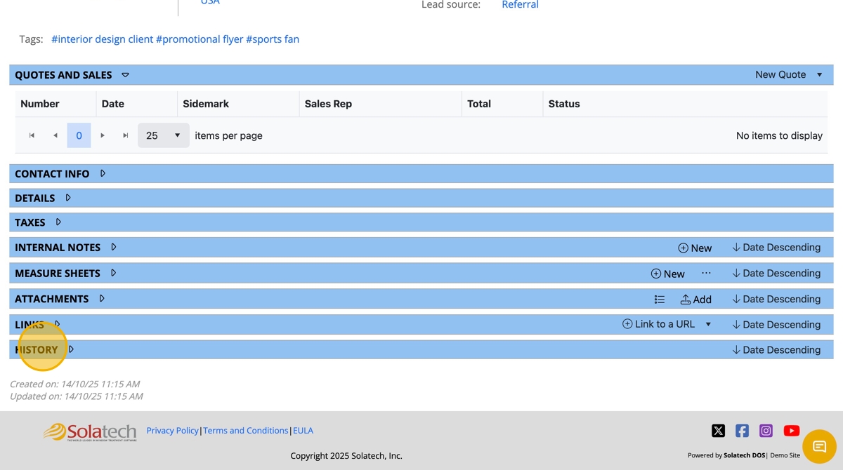 The customer history is a a record of any update or change that is made in the system with who and what was changed.