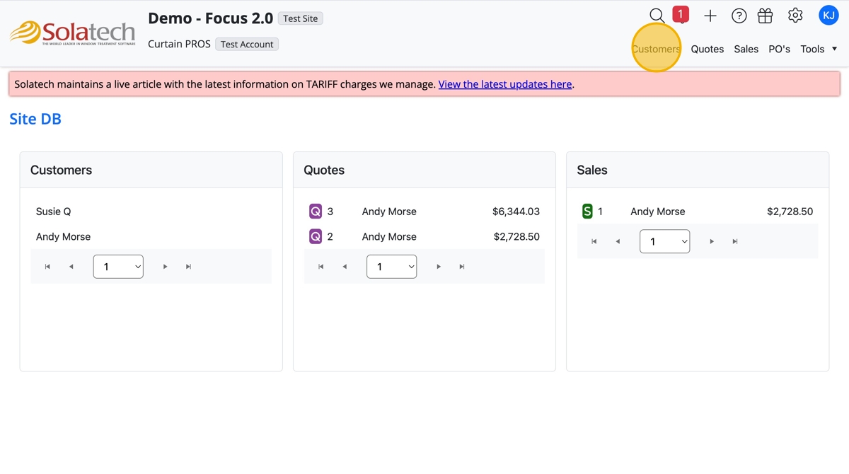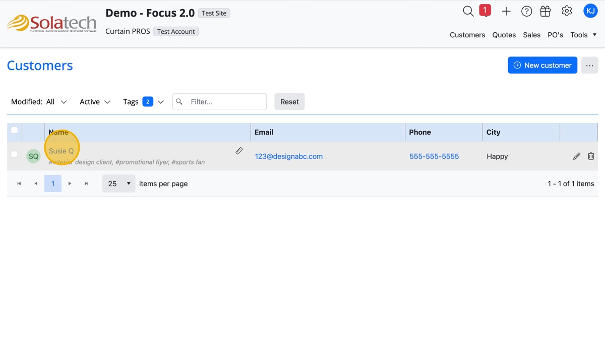 - Click "Customers" tab or find the Customer name on the Dashboard and click the name