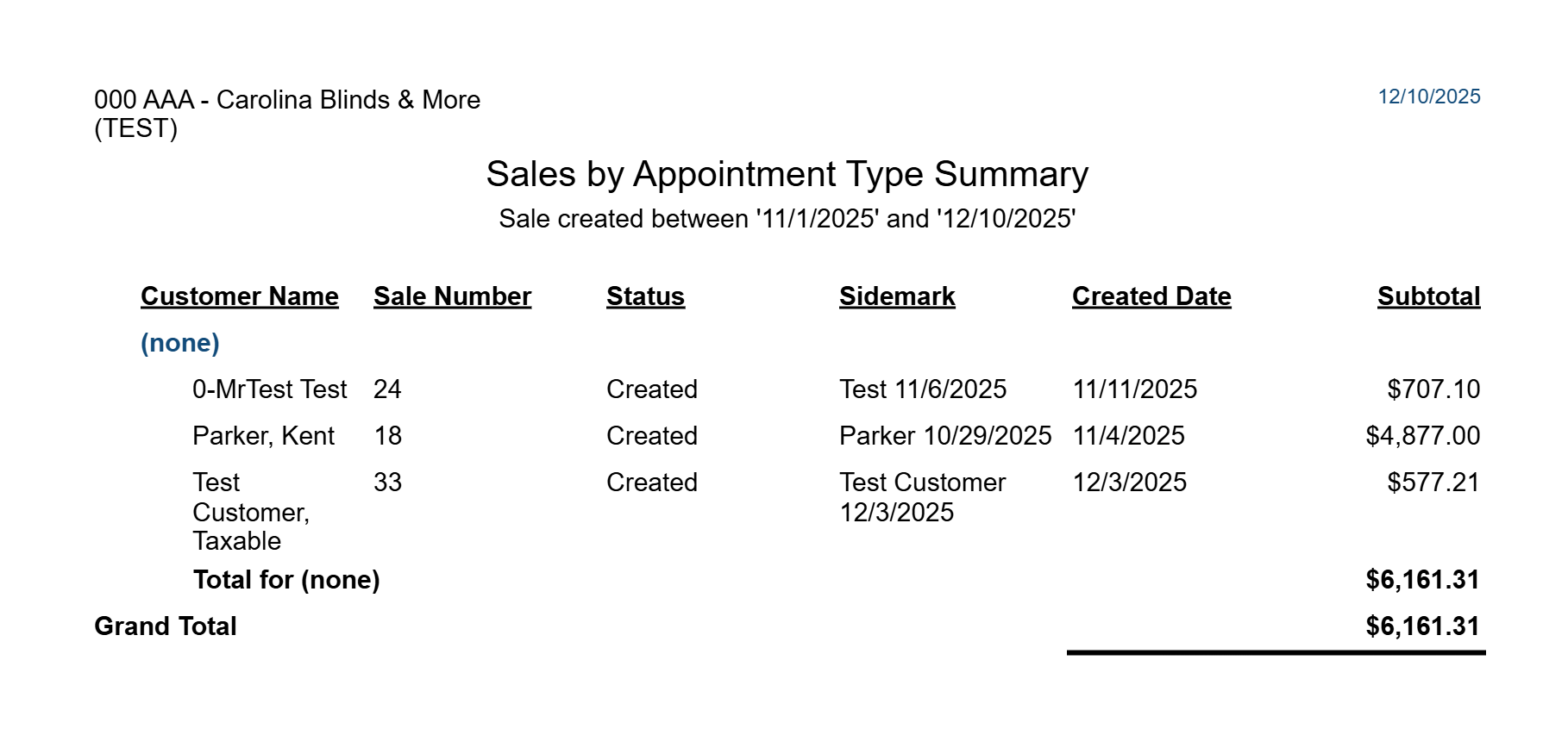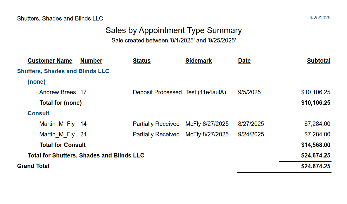 Quotes/Sales and Customers List > Sales by Appointment Type Summary