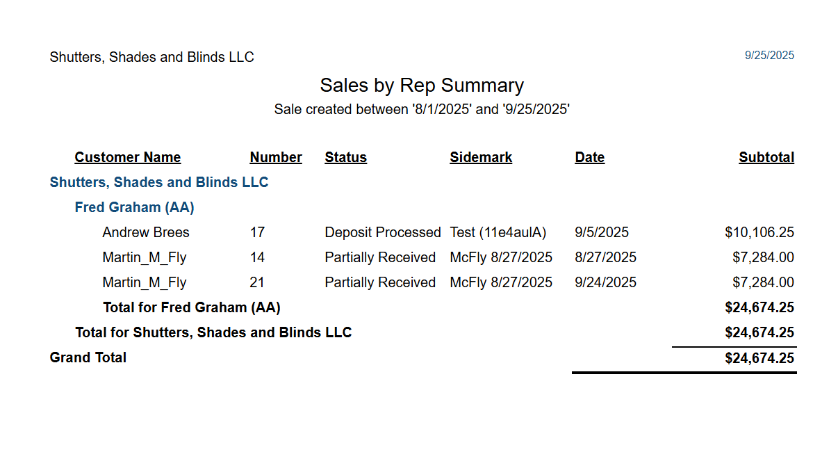 Quotes/Sales and Customers List > Sales by Rep Summary