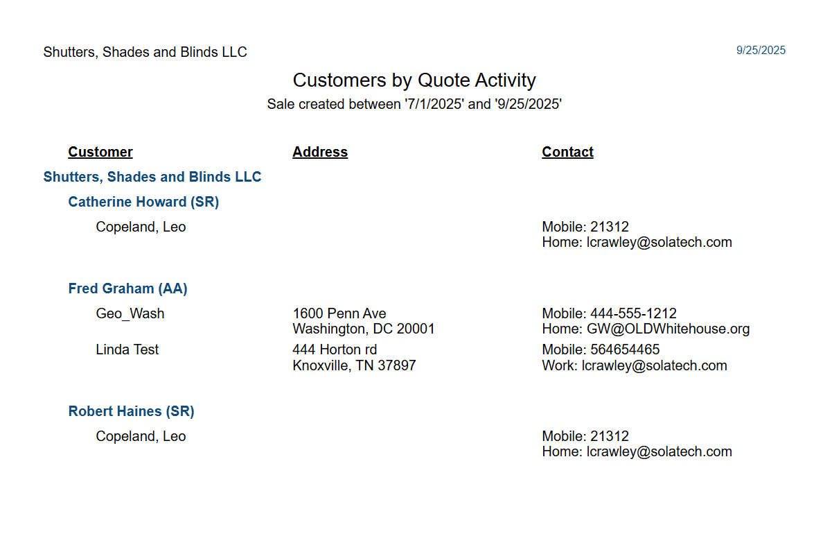 Quotes/Sales and Customers List > Customer by Quote Activity