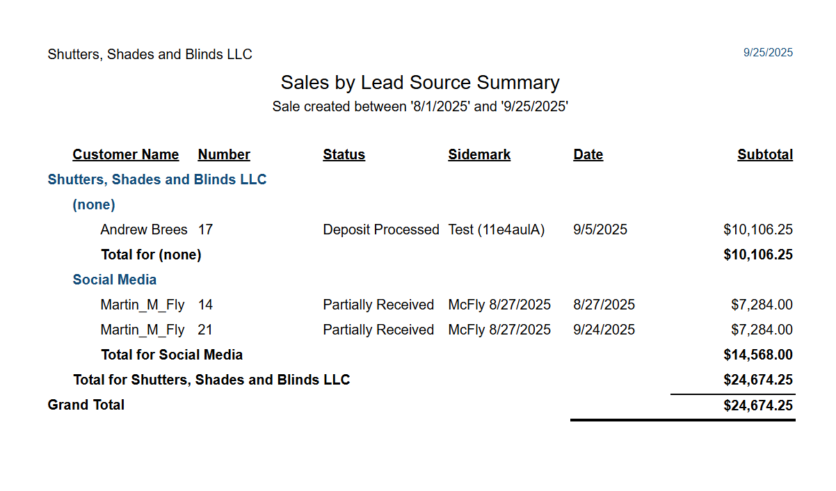 Quotes/Sales and Customers List > Sales by Lead Source Summary