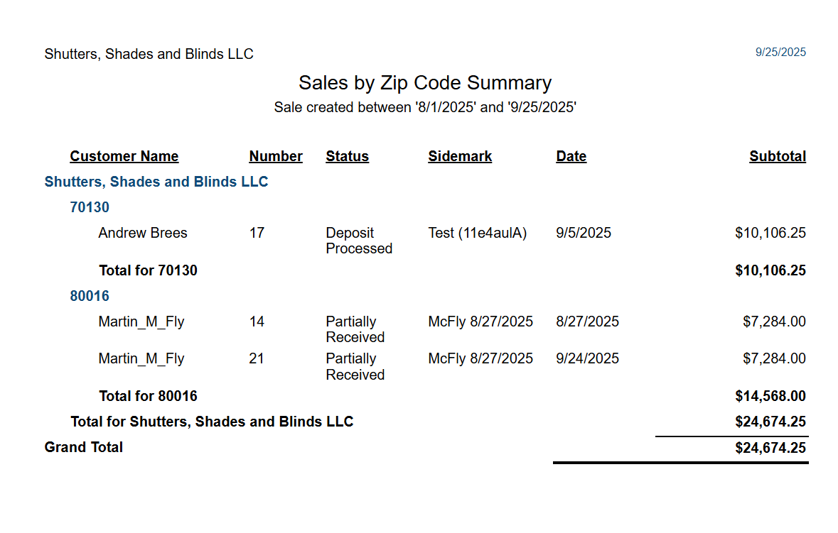Quotes/Sales and Customers List > Sales by Zip Code Summary