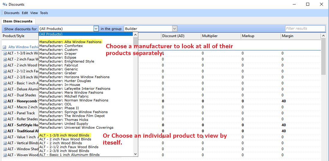 - Note: If the vendor discount varies by style, a discount must be applied to each style. And if discounts are applied at the option level, a discount must be applied to each choice at that option. Once any style or option within a product has a unique discount assigned, a discount at the product level will not act as a default for the remaining styles/options. All styles/options will have to have a discount. A product-level discount will cause the style-level or option-level discounts to be ignored.