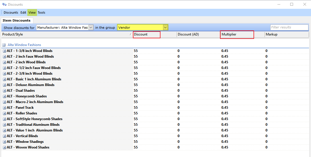 - Be sure that the group shows "Vendor". In the columns following the Product/Style, you will see Discount (which is always shown) and Multiplier; if multiplier is not shown, click on View on the toolbar and check Multiplier.