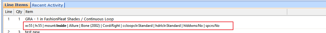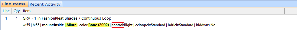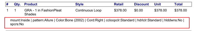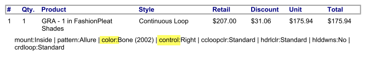 back at our Quote, we see the headings mount, pattern, Color, Cord,