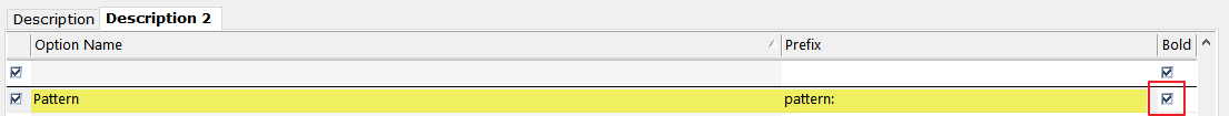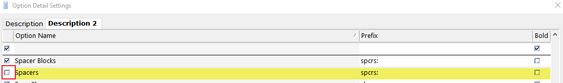 - The Option Detail Settings window will appear. There are two tabs, Description and Description 2. The Prefixes in the Description tab will show up on an Order Confirmation, Invoice, and in Order Entry, while the prefixes on the Description 2 tab will show up on the Quote preview or print-out.