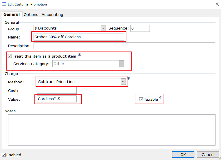 - Check the "Taxable" box if the Customer Promotions affects a product price or taxable service.