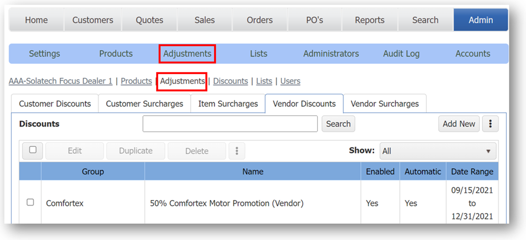 The Solatech Adjustments and Promotions feature allows Site Administrators to create and assign adjustments and promotions for their accounts. Site Administrators can also choose to take advantage of Solatech supplied shipping charges and promotions for Graber and Horizons. Site Administrators can also create their own custom charges and custom discounts which can be either automatically applied or added as needed. This knowledge base article will teach you the basics of using Adjustments and Promotions.